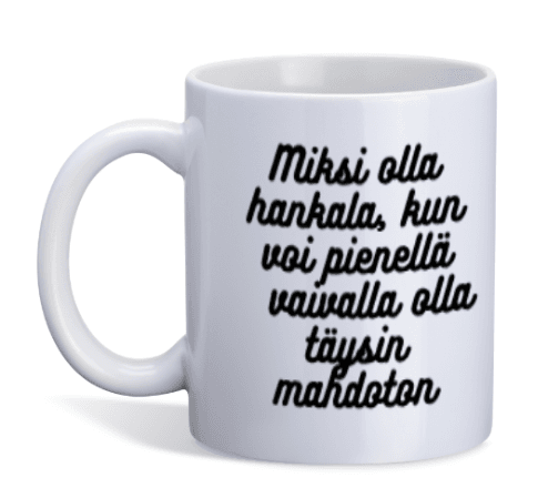 Mukin tilavuus 3,3 dl. Korkeus 90mm ja halkaisija 8mm. Konepesu max 30-astetta. Laita tilauksen viestikenttään kumman kätisenä mukin haluat. Kuvan muki on niin sanotusti oikea kätinen. Mikäli haluat kuvan toiselle puolelle mukia tai tietyllä värillä niin kirjoita se tilauksen lisätietokenttään